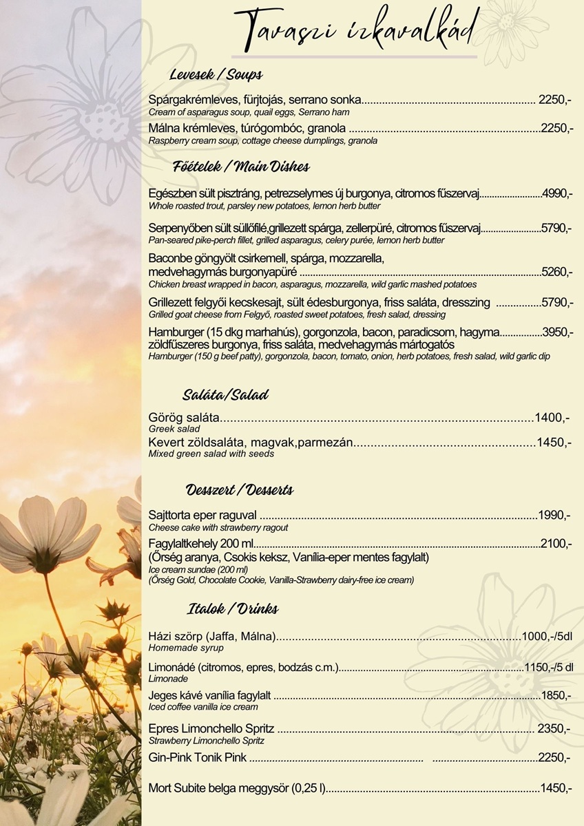 A modern gasztronómia kedvelőit és a magyaros, házias ízek hódolóit szakképzett és udvarias személyzet várja. Az étterem területén a zárt belső parkoló mellett külső parkolási lehetőségek is biztosítják az ide érkezők kényelmét és biztonságát. A parkolás díjtalan!